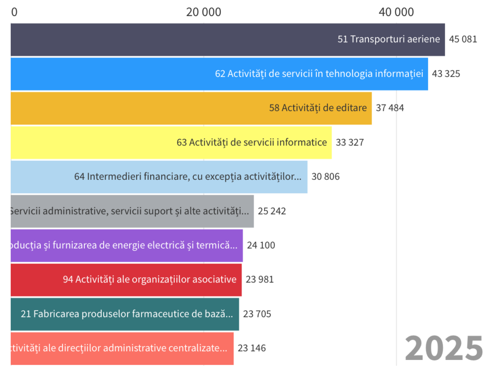 Surpriza vine din zona creativă: activitățile de editare urcă pe locul trei, cu un salariu mediu de 37.484 lei — semn că industriile de conținut și media pot deveni tot mai valoroase economic.