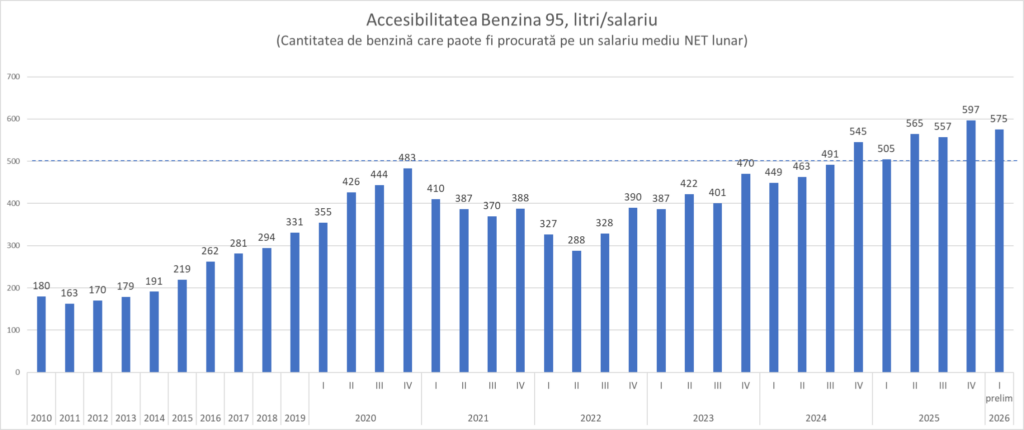 „În T4 2024 am depășit pentru prima dată pragul de 500 litri de benzină pe un salariu, iar în T4 2025 accesibilitatea a atins un maxim istoric de aproape 600 litri”, explică expertul.