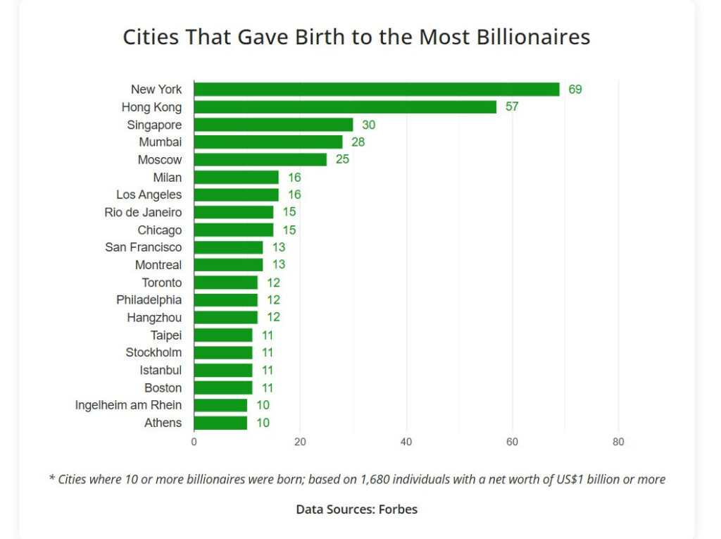 Pe primul loc în lume se află New York, orașul cu peste 120 de miliardari, datorită rolului său de capitală financiară globală și a prezenței marilor fonduri de investiții și companii internaționale.